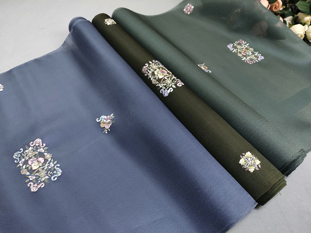 真丝手绣老苏绣打籽绣欧根纱布中装旗袍国风设计师面料灰蓝橄榄绿热门设计联盟服务商