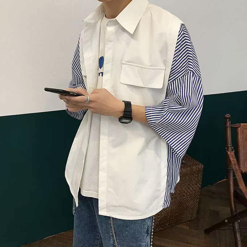 。蓝白拼接外套男双色衬衫条纹长袖鸳鸯春衫衣心机设计感韩风韩版热门设计联盟服务商