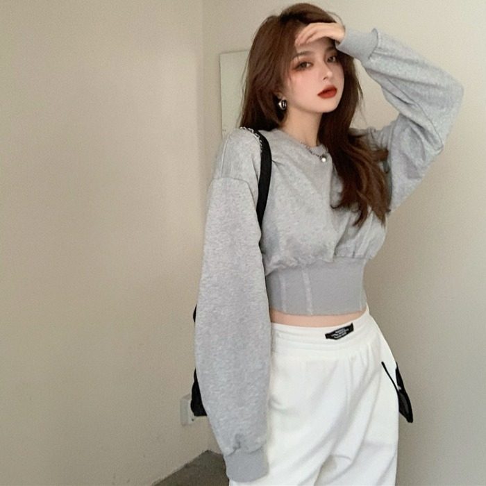 ins炸街短款收腰套头卫衣女嘻哈爵士舞设计感高腰宽松束脚裤套。热门设计联盟服务商